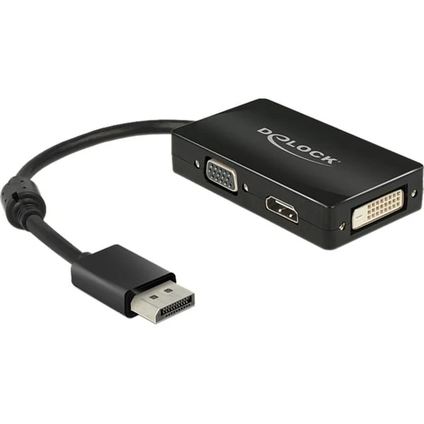 Mit diesem schwarzen Displayport Adapter von Delock kann man sein System um eine VGA, HDMI und DVI Schnittstelle erweitern und verschiedene Geräte, wie z. B. Fernseher, Projektor, PC Monitor etc. anschließen. Es kann nur ein Monitor am Adapter betrieben werden, nicht mehrere gleichzeitig.Art.-Nr.: 1231058