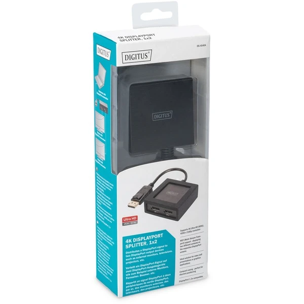 Mit Hilfe des DIGITUS DS-45404 kann man ein DisplayPort Signal auf bis zu zwei DisplayPort-fähige Geräte verteilen, wie zum Beispiel externe Monitore, Fernseher oder Beamer. Dank der MST (Multi-Stream-Transport) Unterstützung, hat man die Möglichkeit, die Desktop-Oberfläche zu duplizieren oder alternativ komplett unabhängige Inhalte auf jedem Monitor darzustellen. Das steigert die Produktivität, da Multitasking-Anwendungen deutlich erleichtert werden. Der Splitter bietet somit eine ideale Lösung sowohl für gewerbliche Anwendungen wie z.B. für Video-Wand-Präsentationen, Grafikanwendungen oder Produktdarstellungen (Büro-/ Geschäftsräume, Messestände etc.), als auch im privaten Bereich. Egal ob Bilder, Präsentationen, Filme/Video oder Spiele, mit dem Digitus DisplayPort Splitter DS-45404 werden die Inhalte in ultrascharfer 4K UHD Auflösung und das auf bis zu zwei DisplayPort-Monitoren dargestellt.Art.-Nr.: 1378484
