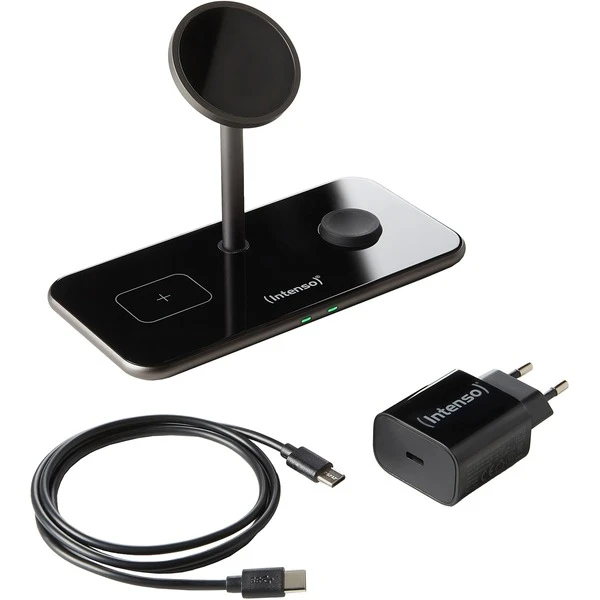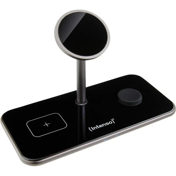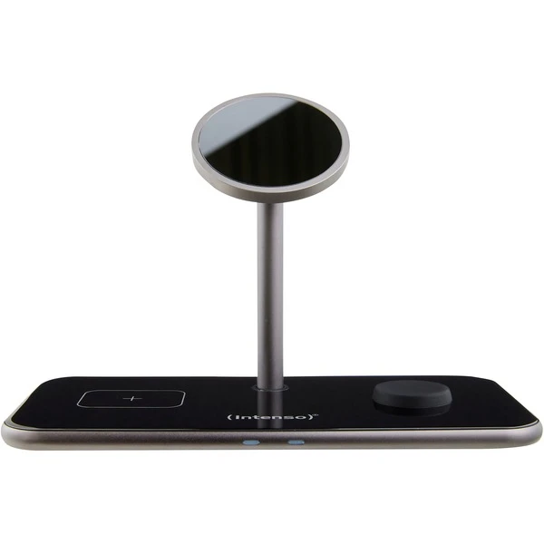 Die Ladestation 3in1 Wireless Charger MB13 von Intenso ist eine induktive Ladestation mit magnetischem Standfuß. Der platzsparende 3-in-1 Wireless Charger lädt ein Smartphone (mit bis zu 15 Watt), eine Applewatch (mit bis zu 2 Watt) und die Earbuds (AirPods und andere Modelle, die kabelloses Laden unterstützen) mit bis zu 5 Watt parallel mit Schnellladetechnologie auf und sorgt gleichzeitig für Ordnung auf dem Nachttisch oder Schreibtisch. Der magnetische Standfuß sorgt dafür, dass MagSafe kompatible Geräte (z.B. iPhone12 oder neuer) automatisch auf der Halterung fixiert und sicher positioniert werden. Auch das Aufladen von zwei Smartphones ist kein Problem. Dafür kann die zweite Schnellladefläche anstatt mit Kopfhörern problemlos auch für das kabellose Laden von allen Qi-fähigen Telefonen genutzt werden. Als permanente Ladestation, etwa am Arbeitsplatz oder in der Küche, ist der Wireless Charging Stand MB13 ideal, um die Lieblingsgeräte nebenbei aufzuladen. Der Magnetic Wireless Charger MB13 ist auch die optimale Ergänzung der Heim- und Büroausstattung, denn das elegante High-End-Design mit hochwertigem Aluminiumgehäuse und der Oberfläche aus gehärtetem Glas ist nicht nur praktisch, sondern auch ein optischer Hingucker. Der Wireless Charger MB13 ist außerdem mit einem Überhitzungs- und Überspannungsschutz ausgestattet, so dass man die Geräte sorgenfrei aufladen kann. Das moderne Schnelladesystem bietet ein extra schnelles Aufladen mit bis zu 15 Watt. Damit ist das Smartphone schon innerhalb kürzester Zeit wieder zu 100% aufgeladen. Der Ladevorgang wird auch durch Kunststoffhüllen bis 5mm Dicke nicht beeinträchtigt.Art.-Nr.: 100009494