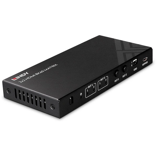 Der 2×2 8K60 Matrix HDMI Switch von Lindy bietet die Möglichkeit zum unabhängigen und zeitgleichen Verteilen von AV-Inhalten aus mehreren Quellgeräten an mehrere Displays in frei wählbaren Schaltkonfigurationen. Die 2×2 HDMI 8K60 Matrix stellt eine solche Lösung zum Verteilen der Inhalte zweier Quellgeräte an zwei Zielgeräte (Displays, TV-Geräte oder Projektoren). Je zwei HDMI-Eingänge und -Ausgänge bieten die Möglichkeit, zwischen zwei separaten Quellgeräten und zwei angeschlossenen HDMI-Displays umzuschalten und Videosignale von einer oder zwei Quellen auf zwei Displays auszugeben. Die Unterstützung für 8K HDMI-Signale ermöglicht die Übertragung hochauflösender 4K-UHD-Auflösungen bis 3.840 x 2.160@ 120Hz oder 8K 7.680 x 4.320@ 60Hz, wobei die HDR-Fähigkeit (High Dynamic Range) Videowiedergabe mit nie gekannter Brillanz, hohen Kontrasten und einem erweiterten Farbraum zulässt, die perfekte Lösung für hochqualitative Home-Theatre-Umgebungen. Die integrierte Unterstützung für HDCP 2.3 sorgt dafür, dass auch kopiergeschützte Inhalte nicht außen vor bleiben, beispielsweise bei der Verwendung von Blu-ray Playern, Set-Top-Boxen oder 4K-Media-Playern als Quellgeräte. Das unkomplizierte EDID-Management per Schiebeschalter an der Gerätefront stellt immer die Verwendung der abhängig von der Kombination aus Quell- und Zielgerät bestmöglichen Auflösung sicher. Neben HDMI-Audio-pass-through ermöglichen ein TosLink- und ein 3,5mm Audioausgang auch das Auskoppeln des Audiosignals aus dem HDMI-Datenstrom, etwa zum Ansteuern von Soundbars, analogen Lautsprechersystemen oder AV-Receivern, um so ein immersives Audio-Erlebnis als Ergänzung zu den hochauflösenden Video-Bildern auf den Displays zu generieren. Der Matrix Switch kann auf sehr einfache Weise über Schalt-Tasten an der Gerätefront gesteuert werden. Die mitgelieferte Fernbedienung ermöglicht die Kontrolle über multiple Videoinhalte und Displays, ideal für den Einsatz auf Messen, bei Schulungspräsentationen oder Verkaufsdemos.Art.-Nr.: 100024026