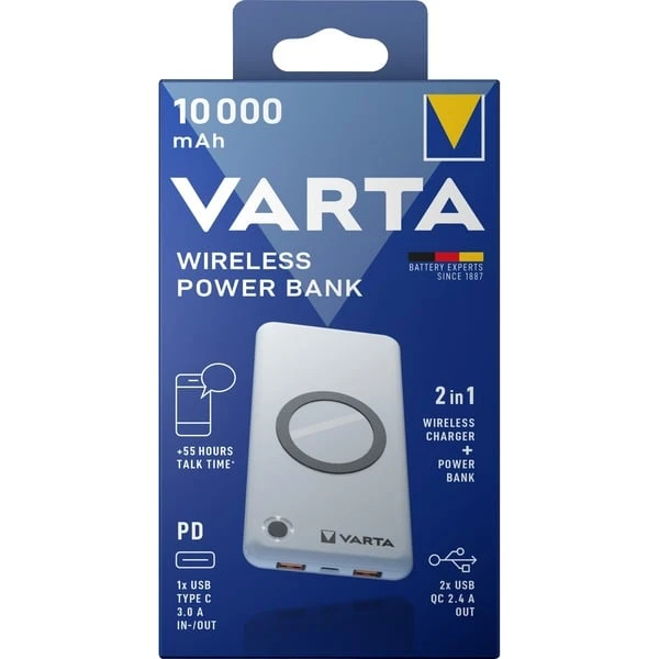 Die kabellose Ladelösungen von VARTA Wireless Power Bank ist ein kraftvolles 2-in-1-Produkt: Wireless Charger und Power Bank mit 3 Anschlüssen (1x bidirektionaler USB Type C PD, 2x USB A QC 3.0). Die erstklassige Ladeleistung sowie der Einsatz von Technologietrends wie USB Type C Power Delivery und Quick Charge kombiniert mit bis zu 10W kabelloser Ausgangsleistung und umfassenden Sicherheitsfunktionen versorgen Smartphones, Smartwatches, Kopfhörer und andere Qi-kompatible Geräte kabellos mit Energie – schnell und effizient.Art.-Nr.: 1829515